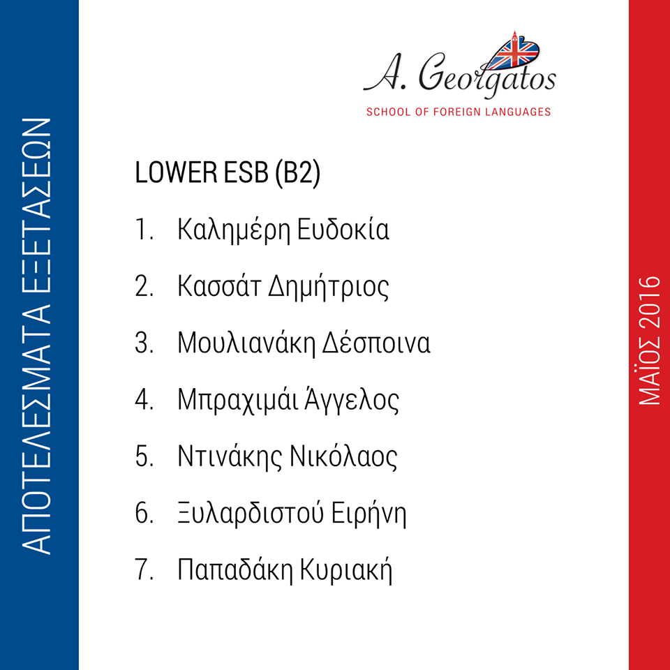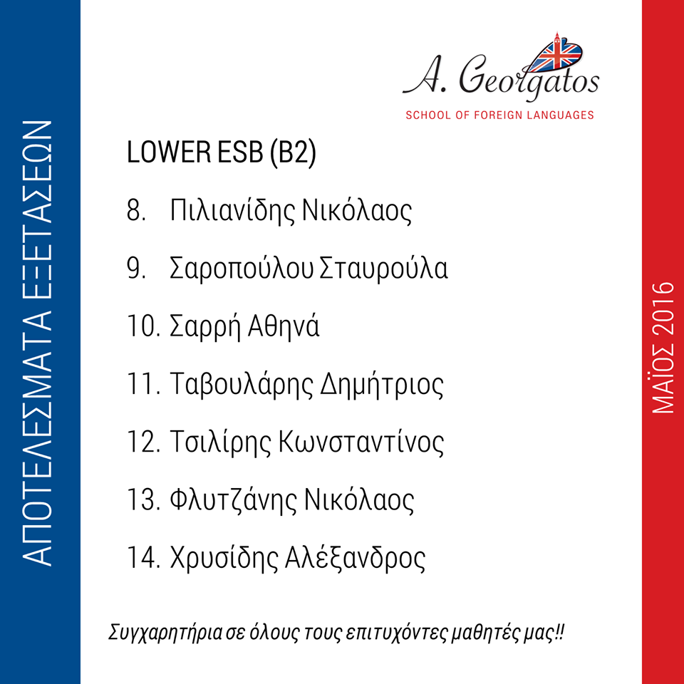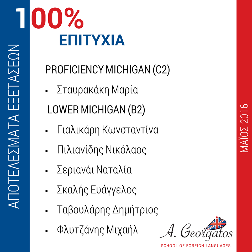 Αποτελέσματα Εξετάσεων Μαΐου 2016 Συγχαρητήρια σε όλους τους μαθητές μας!!! Εκ της διευθύνσεως Α. Γεωργάτος Category: newsBy passion4designAugust 11, 2016Tags: ageorgatosagglikaapotelesmataenglishexetaseisαγγλικάαποτελέσματαεξετάσεις Author: passion4design Post navigationPreviousPrevious post:Άλλη μία σχολική χρονιά έφτασε στο τέλος τηςNextNext post:Εγγραφές 2016 – 2017Related postsΑποτελέσματα Εξετάσεων Μαΐου 2018September 2, 2018Summer Show 2018May 28, 2018Αποκριάτικο Party 2018February 6, 2018Ο Αγιασμός του σχολείου μαςSeptember 27, 2017Αποτελέσματα Εξετάσεων Μαΐου 2017August 31, 2017Καλή ΠρωτομαγιάMay 1, 2017