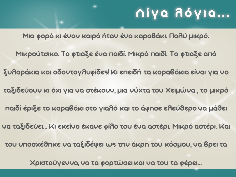 Μία Μέρα Έμεινε Μόνο…!!! Αύριο το απόγευμα στις 17.00 περιμένουμε τους μικρούς μας μαθητές για να απολαύσουν την Χριστουγεννιάτικη θεατρική Παράσταση “Ένα καραβάκι Φορτωμένο Χριστούγεννα”. Category: newsBy passion4designDecember 17, 2014 Author: passion4design Post navigationPreviousPrevious post:Santa’s WorkshopNextNext post:Merry ChristmasRelated postsΑποτελέσματα Εξετάσεων Μαΐου 2018September 2, 2018Summer Show 2018May 28, 2018Αποκριάτικο Party 2018February 6, 2018Ο Αγιασμός του σχολείου μαςSeptember 27, 2017Αποτελέσματα Εξετάσεων Μαΐου 2017August 31, 2017Καλή ΠρωτομαγιάMay 1, 2017